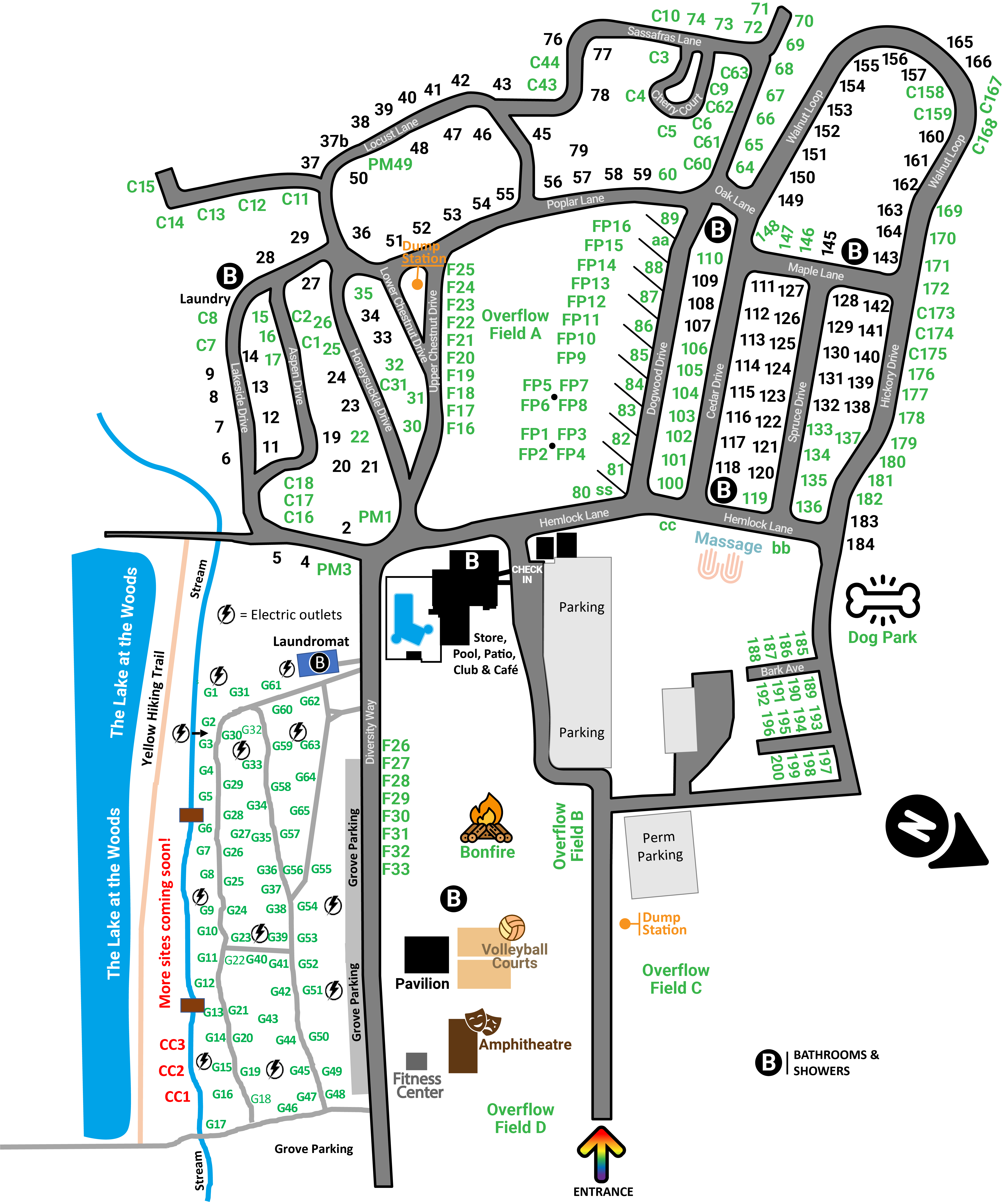 These are terms many guests use, but they are not official classifications of campsites at The Woods.  Please see below for the different ways to camp seasonally at The Woods Camping Resort.